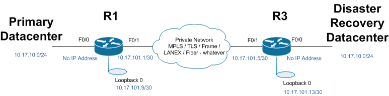 Pseudo-wire In today's data center an important question is: How to react on server outages? One of the possible answer to this question is a second data center in another location with a symmetric internet connection. This second data center can be run on cheap servers. With this setup, data from the primary data center can continuously be transmitted to the secondary one. If one or more server in the primary data center fail (e.g. because of hardware defect) the second data center can be used as fallback. This would be possible, if both of the data centers could be connected on layer 2 so they both share the same address range simultaneously. With expensive, proprietary hardware (e.g. Cisco) this is easily possible. For exactly this problem pseudowire switching can be used as seen in the following picture.