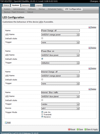 - Firmware Version: OpenWrt Backfire 10.03.1 / LuCI 0.10.0 Release (0.10.0)
