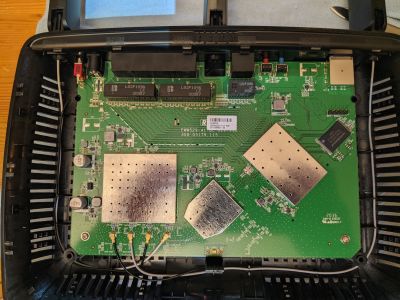 Return the router. Remove the four rubbers, and the screws under them. Notice that there is a thin groove between the main corpse and the lid. Introduce a small flat screwdriver and gently bend until you hear an internal bracket popping. Slowly proceed the same way all along the lid. Be cautious when near the antennas. Just remove the lid.