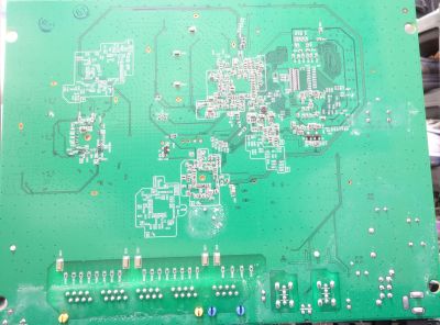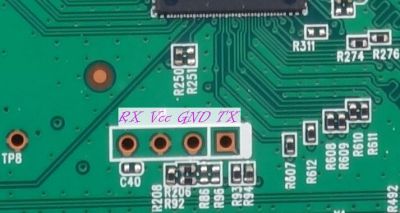 In the lower right is the serial header. The first through hole is TX, second RX and third GROUND. There were two missing resistors at R27 and R24. I placed a 10K on R27 and a 1K on R24 (total shot in the dark based on some reading I had done, but it works). The RX through hole didn't seem to be connected to the right side of the R24 pad so it's got a solder bridge. Use 115200, 8N1, no flow control.
